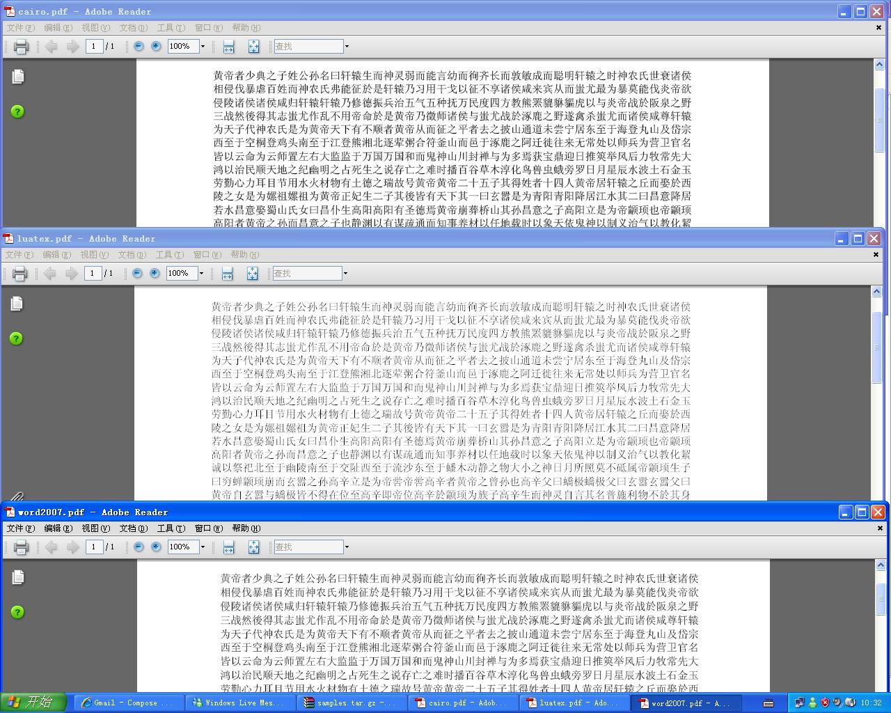 | Description | Reported by Yue Wang: As I mentioned a month ago, I think there is a problem in dvipdfmx code which makes the CID embeded font in the output pdf too thin to read. Because LuaTeX/XeTeX(xdvipdfmx) all use dvipdfmx source code to deal with the CID fonts embedding, So nowadays all the pdf file output by TeX seems problematic. Today I have some free time and make some sample pdf files for you. I use the cairo and word2007 output for comparasion. All files are in the attachment now. It seems that the LuaTeX output is the thinnest of the three, as can be seen from the jpg file. | ||||